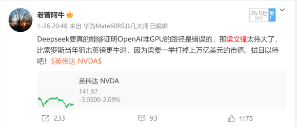 曾文凯:DeepSeek 出来后,我觉得是历史性事件,1月25号就做空英伟达,并且在周末,1月26号,我写一条微博,预测梁文锋将打掉美股上万亿市值。果然,1月27日美股暴跌上万亿,因为觉得还是无法动摇英伟达中期的看好逻辑,只是短线的机会,我很快就平仓了。
